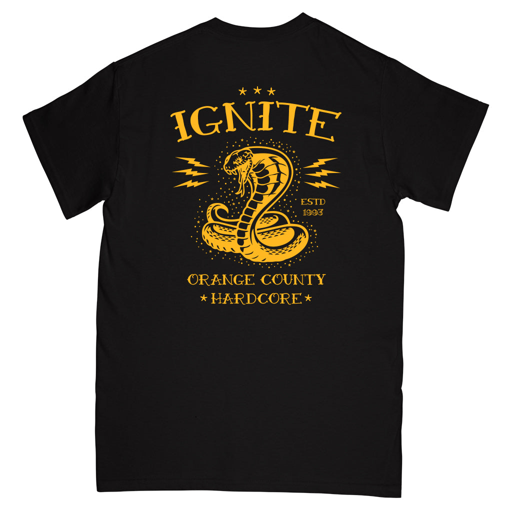 One-color front, one-color back, Ignite "Cobra" short sleeve t-shirt on black, 100% cotton, Tultex 202 shirts.