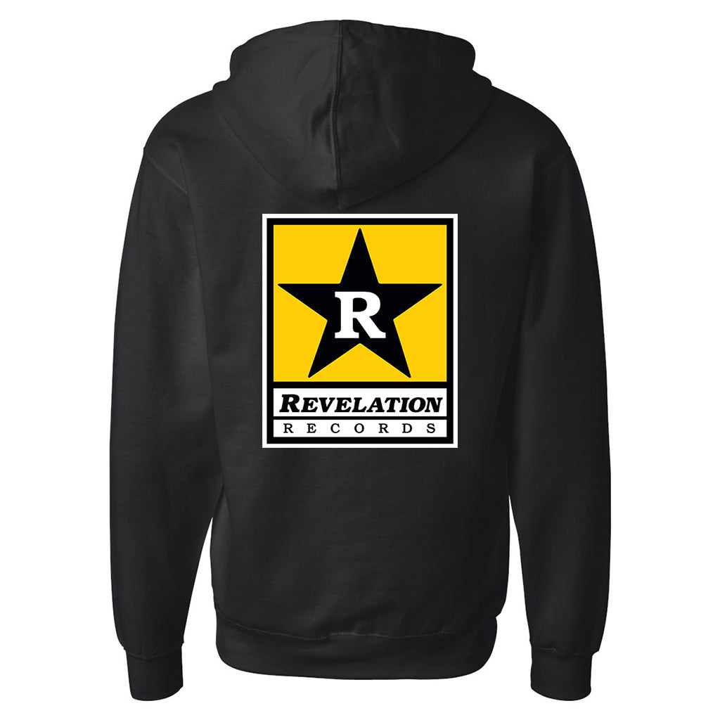 Three-color front, three-color back, Revelation Records "Logo" zipper hooded sweatshirt on black, Independent Trading Co. IND4000Z sweatshirts.